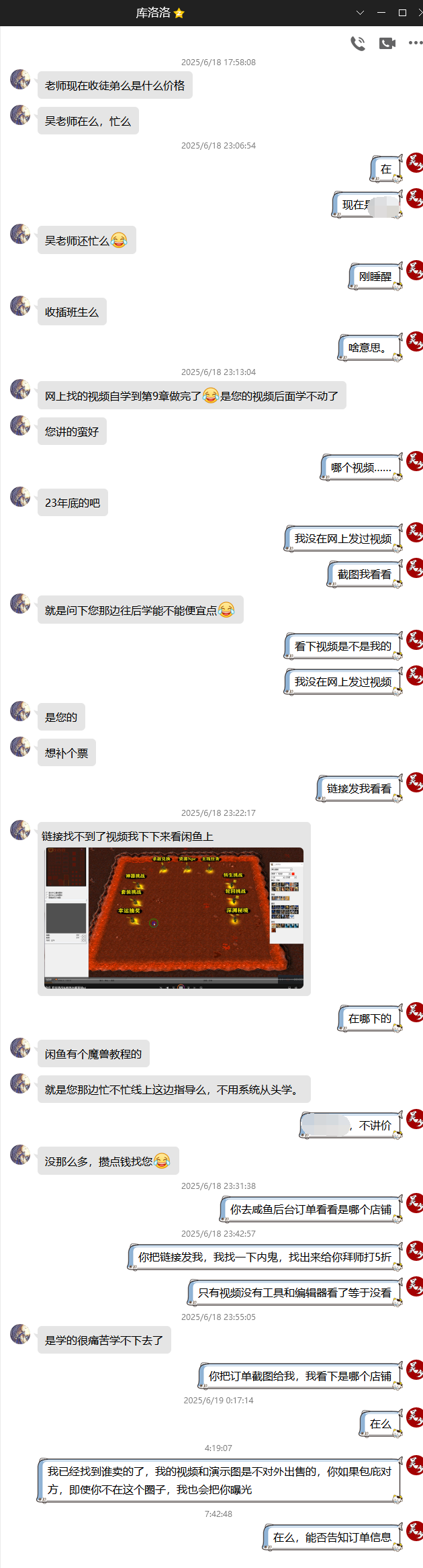 | 具体经过: | 具体经过看在线文档吧 魔兽二道贩子贩卖吴少教学视频及演示图证据,全网狙击 https://docs.qq.com/sheet/DRU9QUFBkRm9KYkta?right_flag=1 |