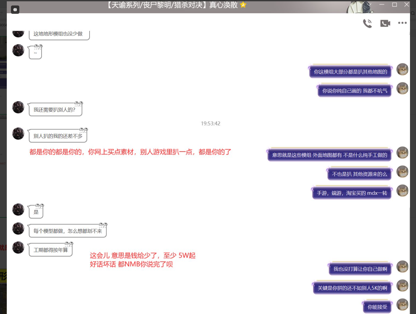 | 具体经过: | 2022年7月份左右,因需找作图合作伙伴,与其协商制作费用20000元整,知道2022年年底王超志(制作承包人)游戏进度没有制作丝毫,于是与其协商还清欠款,刚开始一个礼拜只给200元,到后边找各种理由不给钱,期间其商城上架地图跑下的流水各种理由称没有钱,近期此人音信全无,电话,微信打了几十个就是不接,这种人不知道怎么长这么大的,具其本人亲口所说全家只剩他一个人(不知道这是不是报应不爽),事情就是这么个事情,望可以由此事点醒各位作者,合作需要擦亮眼睛,合作的合同就不放出来了。 |