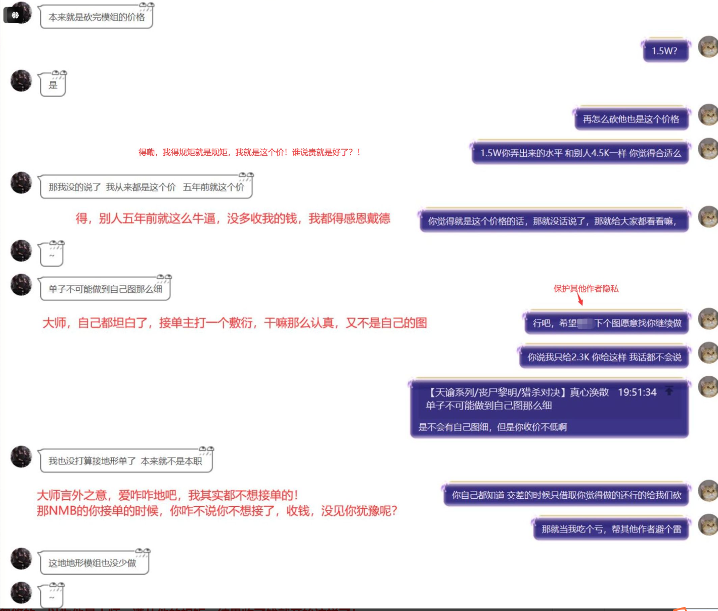 | 具体经过: | 本人找到魔兽圈内名称为:“真心涣散”的个人进行外包地图模型项目并且花费 1.5 万定制魔兽地形,结果却令人心情不悦,做出来的满意度可以用非常糟糕来形容。 本人出于对该个人的信任直接全款支付了该项目的费用,却换来了这样的成果。 (先付了7500的定金,然后回来交付的时候说必须要给尾款才能给文件,当时没想到他会来这一手叫这么一个敷衍的东西) 我只想说这是出于信任的关系才信誓旦旦把这个事情交给你做,而你却用极度敷衍的态度来做这个事情。 在第一次交工后,我们表达了对地形质量的不满,他也觉得很丑,答应优化,结果等到的优化版本,就是在整个地形里面塞了几个莫名其妙悬空的楼梯。然后后续协商就是摆烂,不愿意改! |