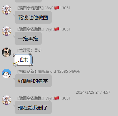 | 站长补充说明: | 这个人是原先一个叫落宸的,本站曝光台中可以通过搜他另一个QQ号搜到他的相关事迹,图片太多了,传不完,已打包至网盘https://pan.baidu.com/s/1XvTpppfHdJaLvsVd5WU7fg?pwd=ikjp 这次的事件具体站长也知之甚少,图片也都是群内同胞提供,我这波只能吃瓜,没有深入了解 |
